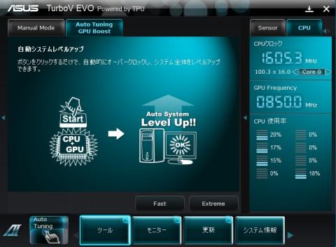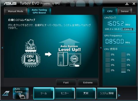 上部タブのAUTO TUNING から下のFASTをクリック起動します