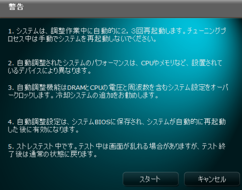 AutoTuningを実行すると、このような警告ウィンドウが表示されますので、内容を理解した上でスタートボタンをクリックします。後は、何度か再起動をしつつ自動的に設定を行ってくれます。