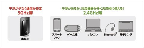 また、電波の特性上、2.4GHzよりも、5GHzのほうが、障害物に弱いようです。