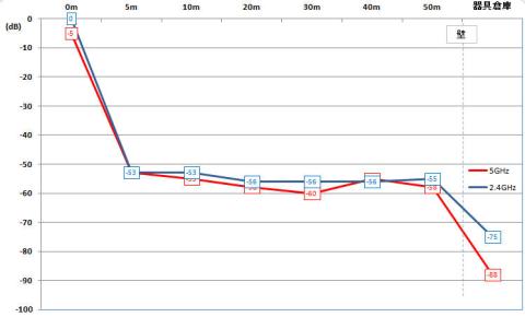 2.4GHz帯と5GHz帯をそれぞれ(5m,10m,20m,30,40m,50m, 壁を隔てた倉庫)測定。