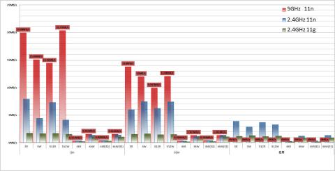 この図から、2.4GHz帯では混雑(電磁波干渉)による速度低下が発生しやすい。