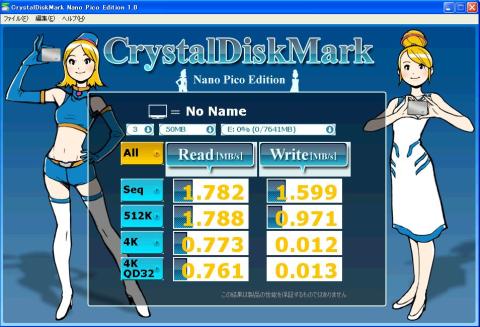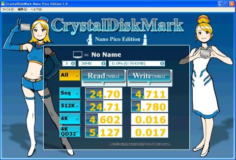 「CrystalDiskMark」にて測定を行っていました(50Mにて実施)。