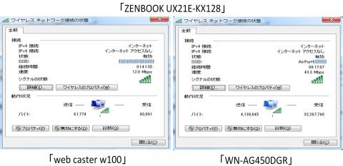 「ZENBOOK UX21E-KX128」(ウルトラブック)と「FMV BIBLO NF/D75」(ノートPC)を使って、「WN-AG450DGR」と「web caster w100」でのスピードの比較をしてみます。