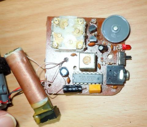 トランジスタの代わりに東芝の FM/AMラジオIC TA2003Pを使い、