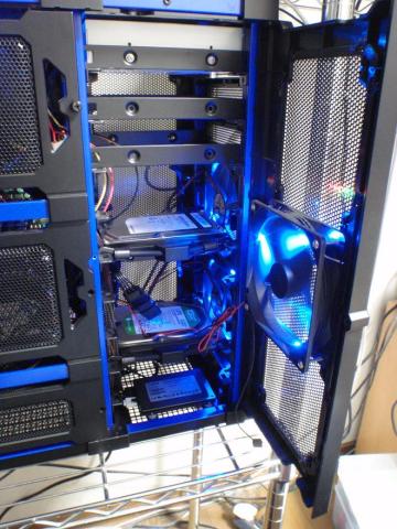 前面×2、簡易水冷をサンドイッチ(×2)、HDD横(サイド)に×1
