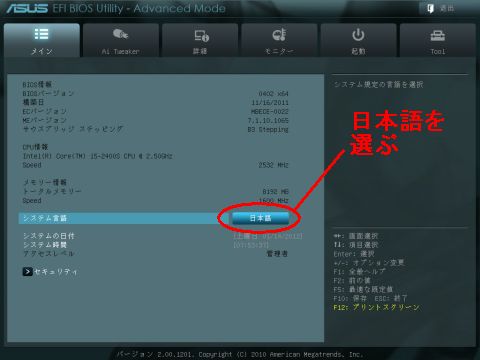 まずBIOS(ってつい言ってしまうけれどEFI(Extensible Firmware Interface))での設定を行う。起動時Delキー連打でEFIに入るが、ここで立ち上がるのは「EZモード」。ボタン設定による「Power Saving/Normal/ASUS Optimal」の3モード切替ができて、ちょっと省電力やちょっと高性能化が簡単に設定できるようになっているが、ここでは詰める設定をするために右肩のボタンから「アドバンスドモード」に入る。