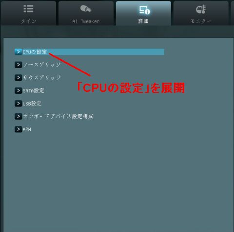 次は最高性能を手動設定で狙うに邪魔な機能を切っていく。「詳細」タブから「CPUの設定」を起動する。
