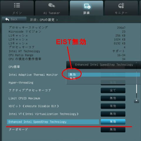 同様に小負荷時にクロックを落とすEISTも無効に。