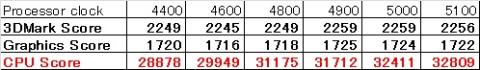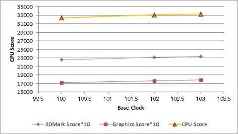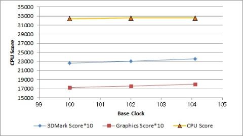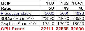 確かに3DMarkのスコアは微増はする。ただこれは主に「Graphics Score」の改善によるものであり、「CPU Score」はほとんど変わらない(むしろベースクロック104.1×49倍の方は微減した)。