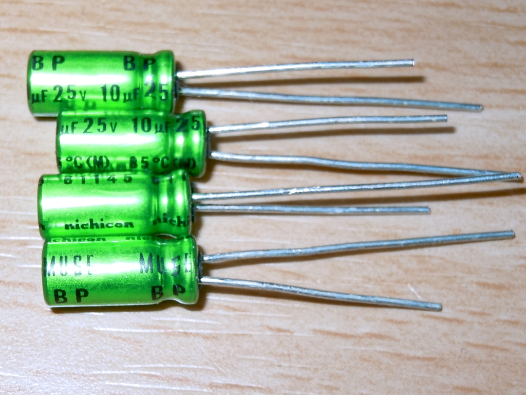 信号経路上に入るカップリングコンデンサ群 C9,C10,C4,C11 (10μ 25V) を MUSE BP に交換しました。