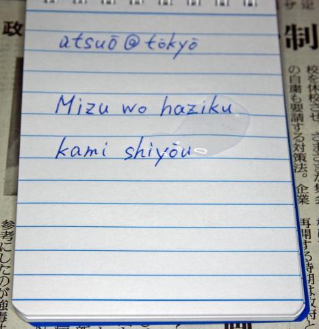 試しにボールペンで字を書いた上に水をたらし、15秒ほどおいて水を拭き取ってみたところほとんど滲みなく、拭いた後もサラッとしてました。