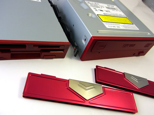 その甲斐あって赤いDVDドライブと赤いFDD&カードリーダーが装着完了!元々拡張性の少ないPCなので、FDDとカードリーダーを1ベイで納められるのはなかなかステキだ。FDDを使うのかは置いておいて!!