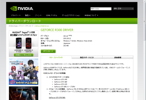 自分は、「GeForce GTX 560 Ti」 なので以下のドライバをダウンロードした。