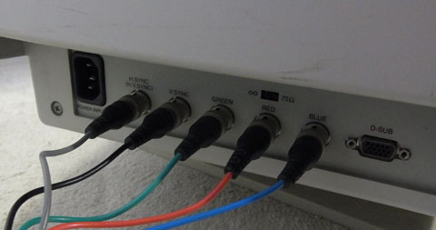 私にとっても母にとってもある種の憧れだったNANAOのCRTモニタ。最近ではほぼ見なくなった5分割タイプの入力ケーブルも付けてくれた。通常のD-Sub入力も備えるので2系統入力となり、切り替え操作もワンタッチで素早く優秀だ。