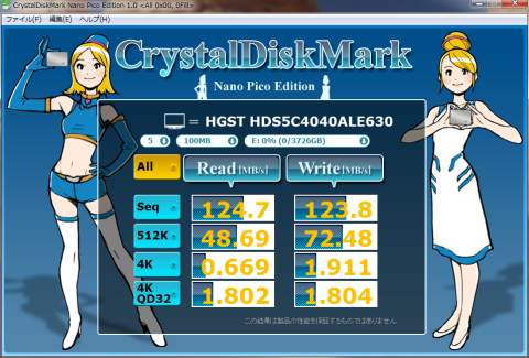 シーゲートやWDCの最新のHDD(170MB/s)と比べるとシーケンシャルアクセスの転送速度は約125MB/sと遅いです。