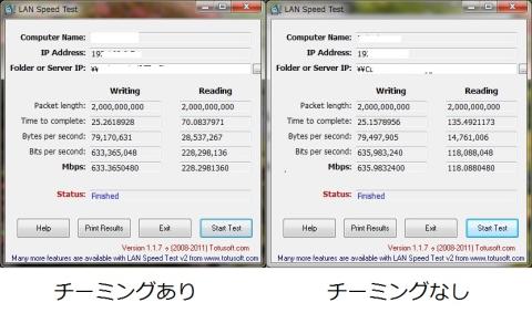 同一ハブ上のPC間で、2000MB転送テスト。一定の効果は出てますね。