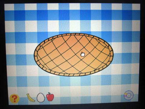 ■はらぺこざる食べものをざるの上にきれいにもりつけましょう。いくつできたかな?