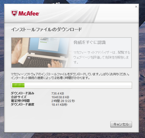これが落とし終わったらインストールが自動的に始まり、そしてPCがMcAfeeさんによる保護下に置かれるわけですね。