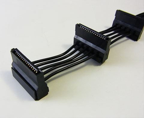 ストレージを隣接ベイに複数搭載した場合、それぞれの間隔が狭くなってしまい、通常の電源ユニットからのケーブルだとコネクタ間のケーブルを余らせて無理やりな曲げ方をして挿したりするハメになる。