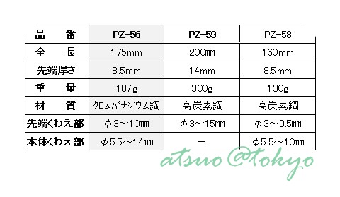 まず仕様を先の大きいネジザウルス(PZ-59)と一番普及している PZ-58と比べて見ていただきます。