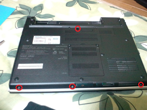 裏面です。赤丸4つを外すと、内部にアクセスできるようになります。上の一つはキーボード、下の3つはタッチパッド部分の固定をしているようです。