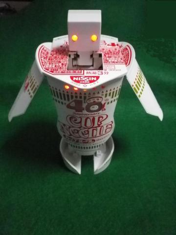 ロボットはレギュラータイプのカップヌードルの大きさです 起動は上部の「PUSH」ボタンを押します 製造会社は ヴイストン株式会社 http://www.vstone.co.jp/ という会社でした