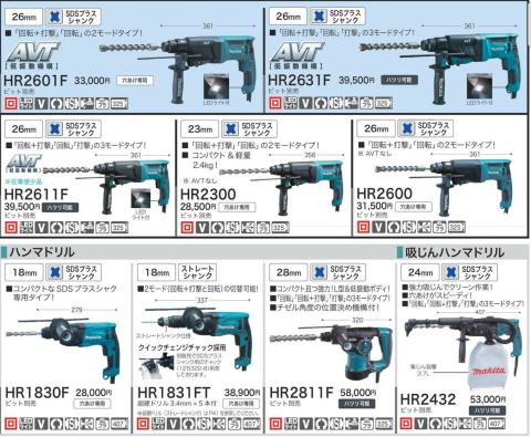 まずは使えるドリルの大きさ・・・HR1830Fは18mmまで、HR2631Fは26mmまで使えます