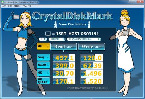 SSD 520 の気持ちの良さを、CrystalDiskMark Nano Pico Edition のスコアで見ましょう