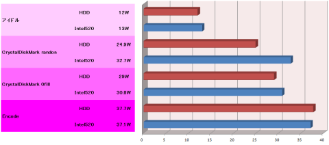 グラフを見ていただけるとわかりますようになぜかIntel520の方が消費電力が高くなっております。