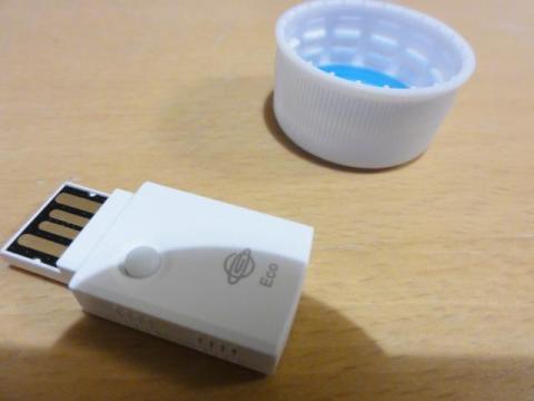 本体サイズは、かなり小さく“大丈夫か?”と思うほど簡素なデザイン。所有してる、どのUSBメモリよりも小さい。ちなみに、丸いボタンは“WPSボタン”。