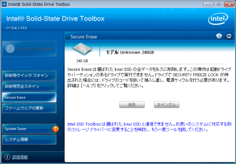 SSDを接続した状態でIntel SSD Toolboxを実行。SSDにパーティションがあるとSecure Eraseできないため、別のHDDからWindows7を起動している。
