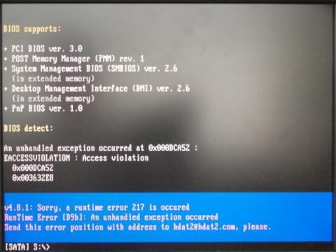 続いて、SATAをIDEモードにしてHDAT2を起動しようとするが、最新であるv4.8.1の起動時にエラーが表示され、動作させることができなかった。v4.8でも同様だったため、動作したv4.5.3を選択し、HPAを行うことにした。