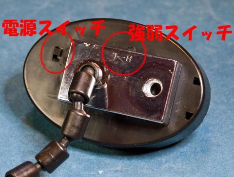 スイッチは台座の下側に二つ付いており、一つが電源スイッチで、もう一つが光量の切り替えスイッチになります。