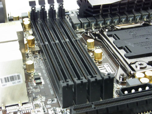 左右4本づつ並んだメモリスロットは片ラッチ式。X79の場合CPU左側(PCケース背面側)にもメモリスロットがあるので、拡張カードとの干渉がし易い故の配慮だろう。但しASUSの片ラッチとはまた形状が異なり、突起があるので一部メモリクーラーの装着も安定させやすい。