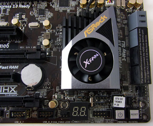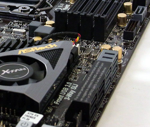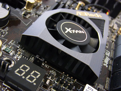 チップセットヒートシンクには最近の製品としては珍しいクーリングファン「X-FAN」を搭載。デフォルト設定では一定の温度になるまで回らない設定で、負荷がかかっても回転数は低く騒音源になることはないので安心だ。もちろん設定を変えてぶん回す事も可能。