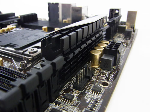 電源フェーズは12+2と上位モデルほどではないものの、LGA2011らしい豪華さ。CPUソケット上部に集中しており、ヒートシンクを挟んで8pin補助電源コネクタがある。