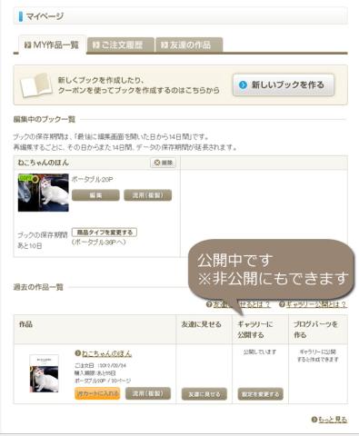 マイページからは、作品の編集、注文や、友達に見せたり、