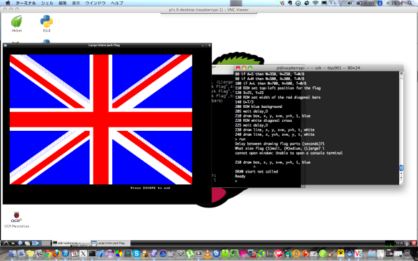しかしながらXはssh経由ではつつけないので、別途VNCサーバー(Raspberry pi用にはTightVNCがあります、クライアントはRealVNCとかご自由に。)を入れてあげるとより快適になります。クライアントから「サーバーのIPアドレス::ポート番号」で繋げます。