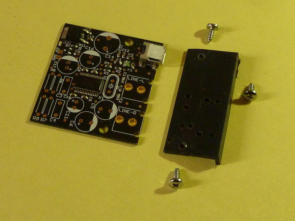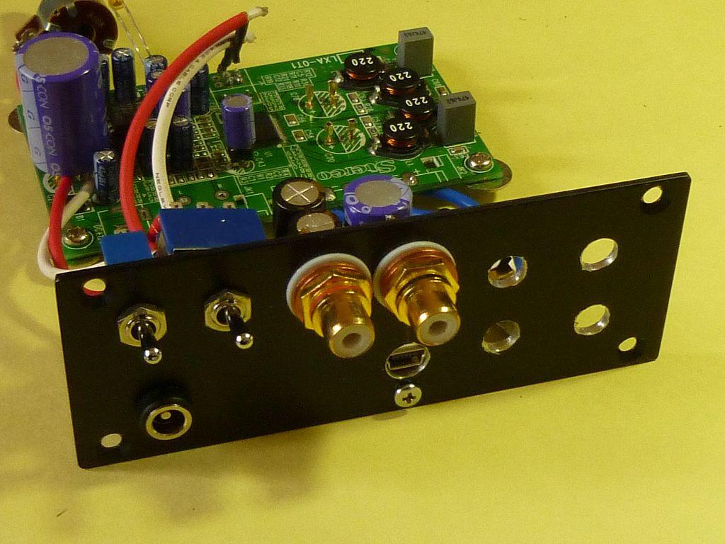 ・上左:miniUSB端子がパネル面と同一になる様に基板パネル側を2mmカット、浅いL型のプラ材に2本のねじで据付けて、それを裏パネルにねじ1本で固定する。
