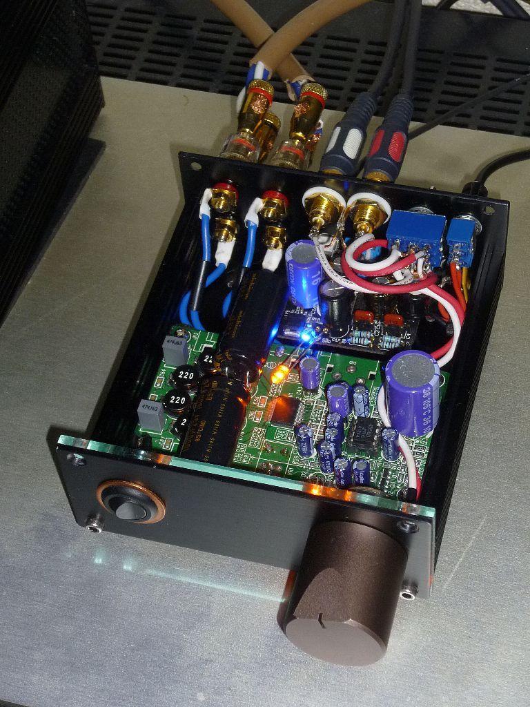 ・上右:USB-DACモジュール完成、電解コンデンサはサンヨーOS-CON(紫)その他はニチコンMUSE-KZ(黒)に、フィルムコンデンサはパナソニックのECQVに変更して組んだ。