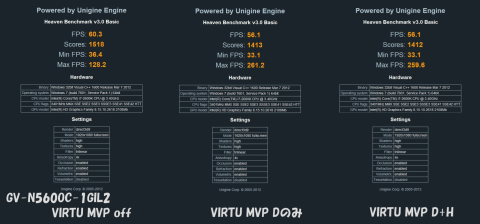 Virtu MVPのOFFとDのみチェック・D+Hのチェックで比較をしたHeaven Benchです。
