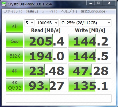 換装後のcrystal diskmark。よそで見るのと同じくらいの数値になりました。