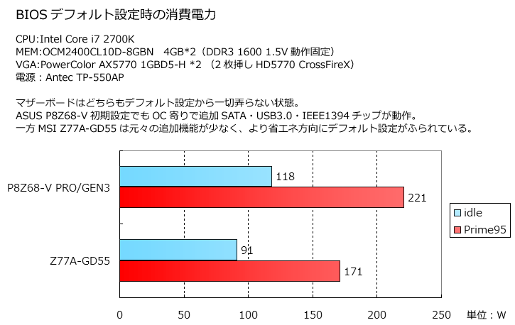 一応グラフ画像内にも注釈を添えたが、元々P8Z68-V PRO/GEN3は初期設定でも電圧等がOC重視に振られており、モデル自体も上位に位置する為、追加SATA3、Bluetooth、USB3.0チップ(Z68はUSB3.0をサポートしていない)、IEEE1394等オンボード機能も多いのが影響しているのだろう。上の基盤写真でも実装部品の数にかなりの差が見て取れる。