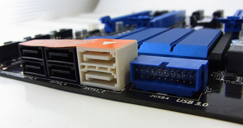 これまたGD65との差異となるSATAポート部。Z77が標準サポートするポートのみで、追加チップはない。また面白いのがUSB3.0コネクタが横向き実装という事。私が使ったマザーの中では初めてのタイプだ。USB3.0ケーブルは硬く取り回しが難しいので、ケースによっては配線をスッキリさせられるが逆にケースと干渉する場合もあるかもしれないので注意。今回使用したAntec P183では良い方向に作用してくれた。