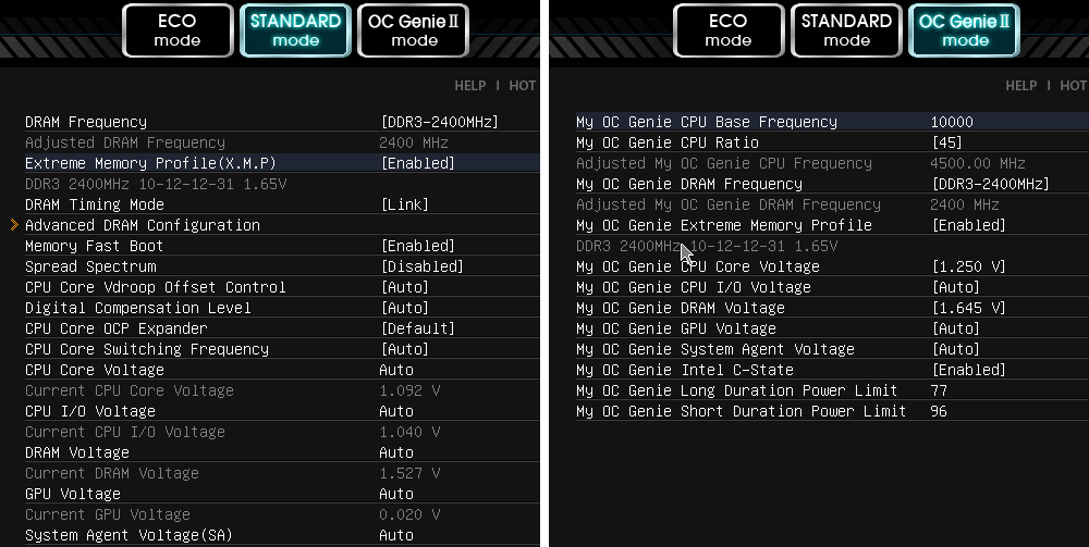 しかしここでOC GeineIIが活躍する。起動前にスイッチでオンオフすれば4.5GHzモードと定格ターボブーストモードを切り替えられるようになった。何コレ楽しい。ついでにOC Geineモードで起動不能な設定を指定してしまったとしてもスイッチをオフにするだけで定格に戻るのだから安心感がある。