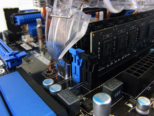 メモリスロットは一般的な両ラッチタイプ。片ラッチタイプに比べて長尺VGAとの位置がシビアになるのだが、メモリクーラーを確実に取り付けられるというメリットもある。
