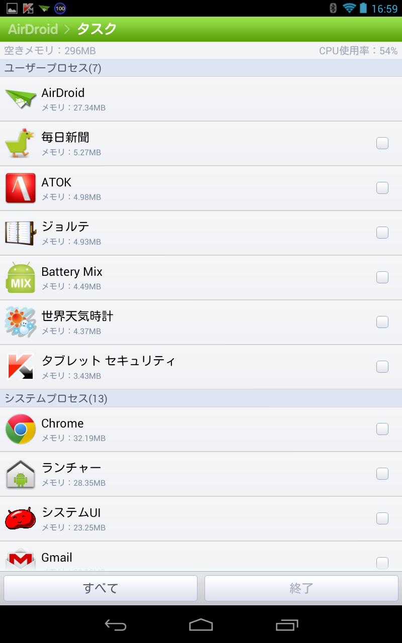 稼動しているプロセスの一覧が表示されます。長押しでアプリの詳細やアンインストールが可能。無駄に常駐しちえるアプリも簡単にまとめて削除できます。