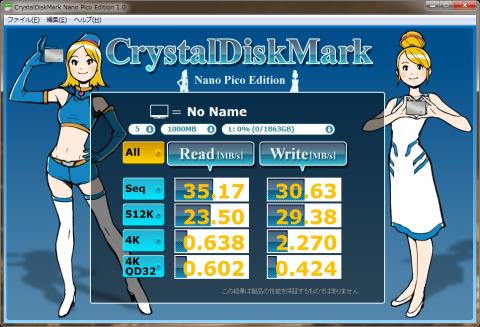 ついでにCrystalDiskMarkでベンチマークを取ってみました。USB2.0なので、参考まで。