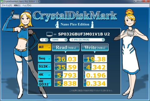 シーケンシャルリードは36MB/sに落ち込んでいますが十分高速です。
