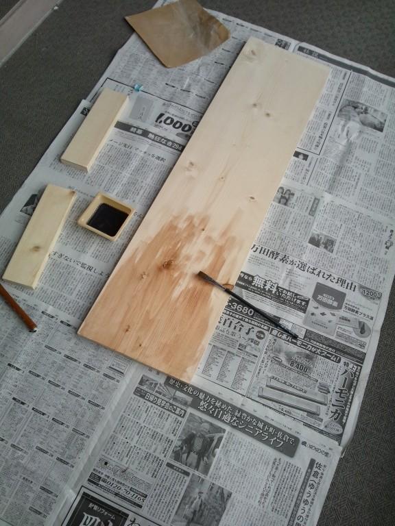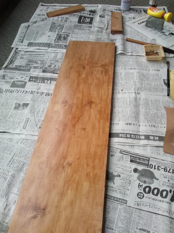 天板になる板と、サイドの足となる板を購入し、着色ニスで塗装。